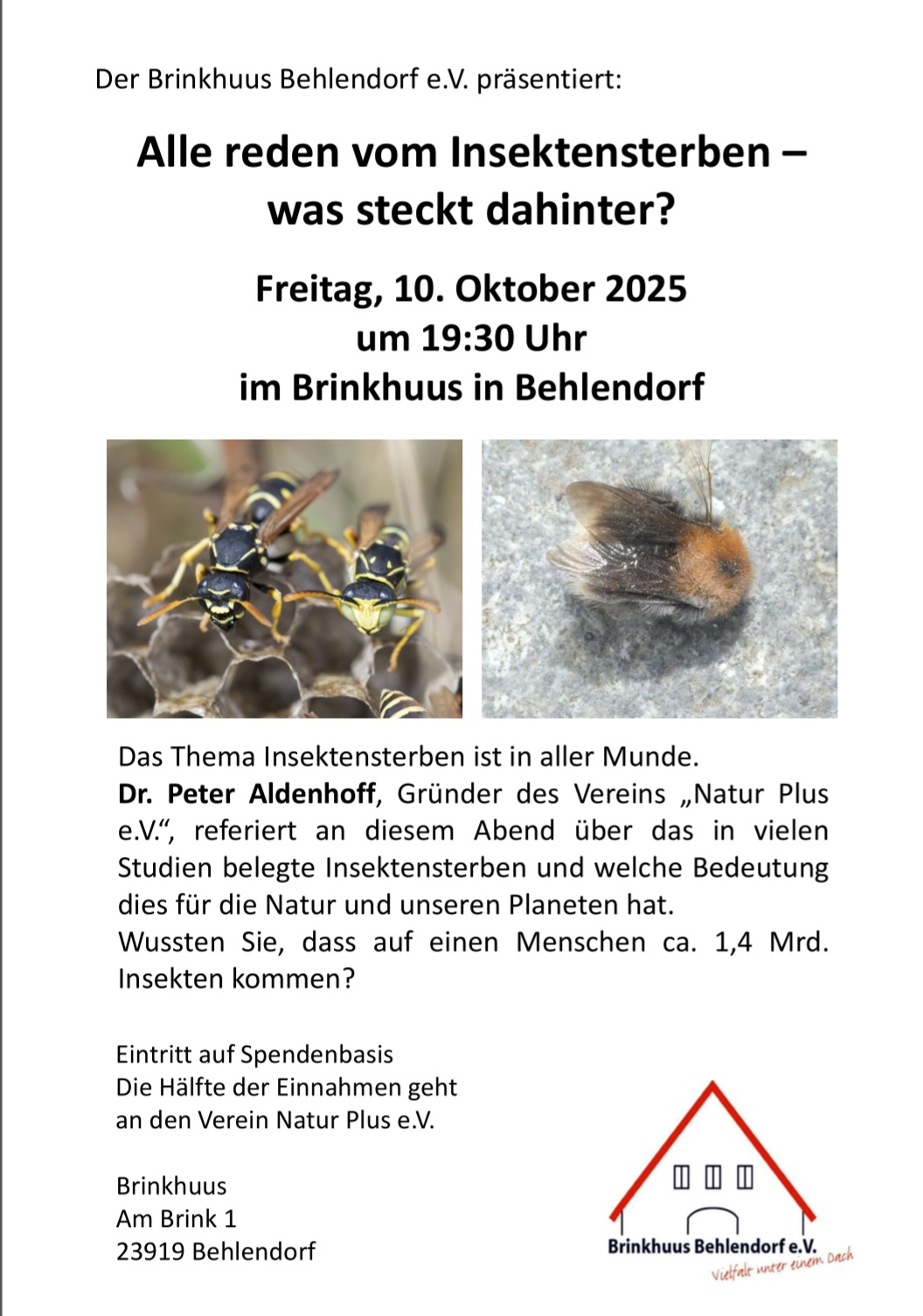 am 10.10.2025, um 19.20 Uhr, referiert Dr. Peter Aldenhoff im Brinkhuus in Behlendorf über das Insektensterben.